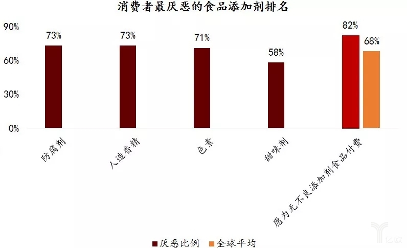 根據(jù)尼爾森健康與食品意見調(diào)查結(jié)果,70%的中國受訪者有特定的飲食需求,82%的人愿意為不含不良成分的食物支付更高價格,兩項數(shù)據(jù)均高于全球平均水平。同時,防腐劑為消費者最厭惡的人工食品添加劑。根據(jù)《小康》雜志聯(lián)合清華大學媒介調(diào)查實驗室的調(diào)查結(jié)果,食品安全問題連續(xù)5年位列“最受關(guān)注的十大焦點問題”榜首。
