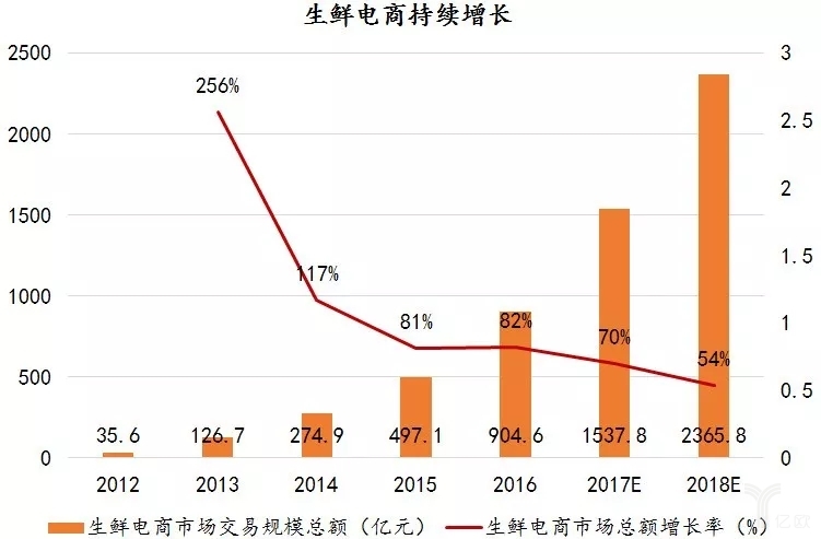 生鮮電商近年備受資本和市場青睞,不斷涌出,生鮮網(wǎng)絡(luò)零售額快速增長。同時,根據(jù)艾瑞咨詢的統(tǒng)計數(shù)據(jù),生鮮電商規(guī)模從2012年的35.6億元,增長到2015年的497.1億元,預計2018年增長到2356.8億元,年復合增長率達到101%。由于生鮮電商產(chǎn)品冷鏈運輸比例遠高于初級農(nóng)產(chǎn)品整體平均水平,這將是帶動總體冷鏈率上升的關(guān)鍵因素,生鮮電商需求也將支撐冷鏈物流市場的增長下限。