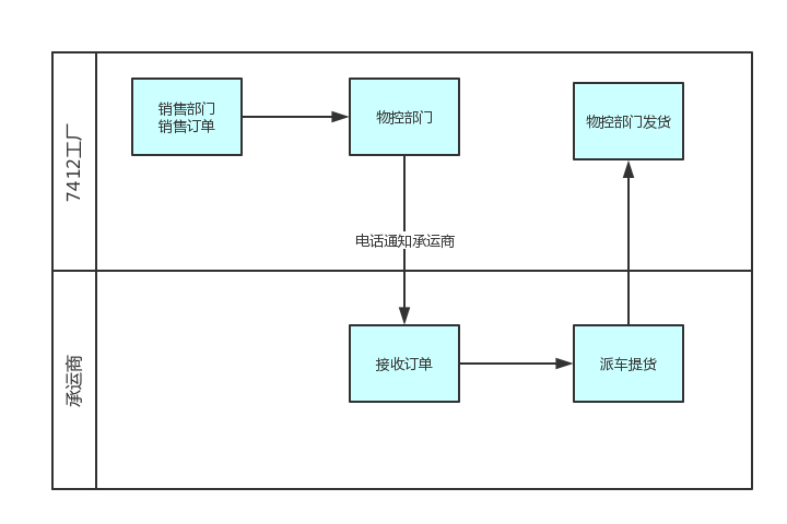 7412工廠與承運商之間的業務主要通過電話通知來提貨,流程不規范。下游承運商均未使用物流管理軟件,承運商整體的信息化水平較低。項目開展前,7412工廠與承運商之間的業務流程如下圖所示: