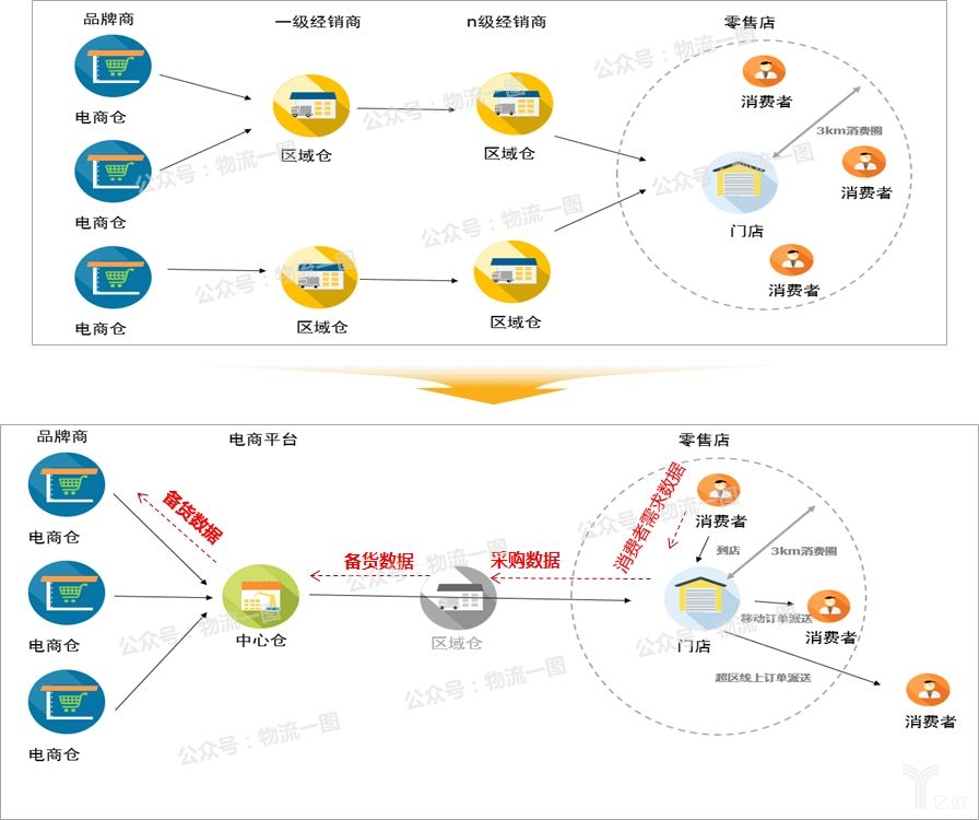 ①去分銷(xiāo)環(huán)節(jié):即砍掉多級(jí)經(jīng)銷(xiāo)倉(cāng),品牌商直接到物流企業(yè)總倉(cāng)(TC倉(cāng))、再到區(qū)域倉(cāng)(RDC),目的是降低產(chǎn)品流通成本,提高流通效率,反應(yīng)到消費(fèi)者身上就是高性?xún)r(jià)比、快速的獲取商品: