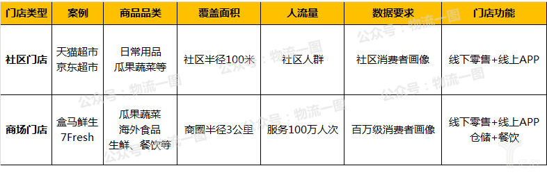 門(mén)店載體按輻射面積可分為社區(qū)門(mén)店和商圈門(mén)店,社區(qū)門(mén)店主要指小區(qū)內(nèi)零售商店(如京東便利店和天貓超市),而商圈門(mén)店指核心商業(yè)街、百貨大廈或大賣(mài)場(chǎng)內(nèi)的綜合門(mén)店(如盒馬鮮生和超級(jí)物種),兩種載體在店鋪面積、消費(fèi)者覆蓋等方面有較大區(qū)別,這也直接決定了店內(nèi)SKU數(shù)量及功能區(qū)別,當(dāng)然對(duì)新零售線上線下能力要求也有較大區(qū)別,具體區(qū)別如下: