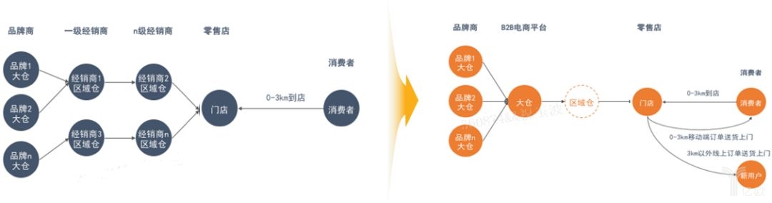 →傳統(tǒng)供應(yīng)鏈向新零售供應(yīng)鏈轉(zhuǎn)型示意圖: