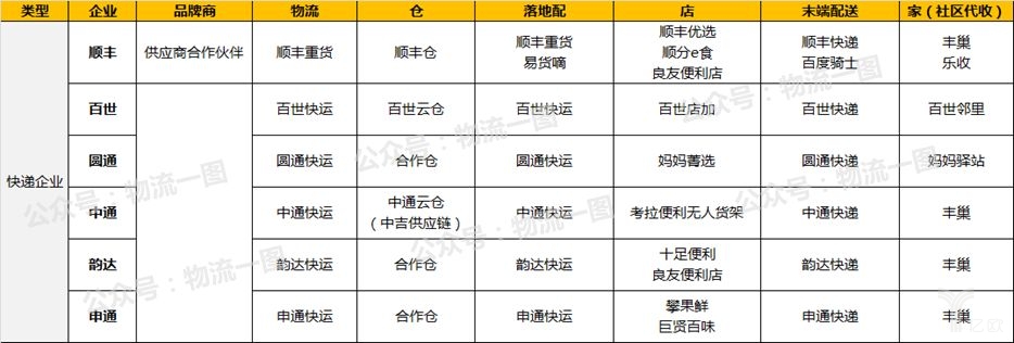 快遞企業(yè)則在物流環(huán)節(jié)表現(xiàn)出強(qiáng)大優(yōu)勢(shì),入倉(cāng)和落地配環(huán)節(jié),順豐、通達(dá)目前都已推出快運(yùn)業(yè)務(wù),且通過(guò)自建或者整合布局有一定量的倉(cāng)儲(chǔ)資源。另外在末端門(mén)店、社區(qū)代收方面也都均有布局: