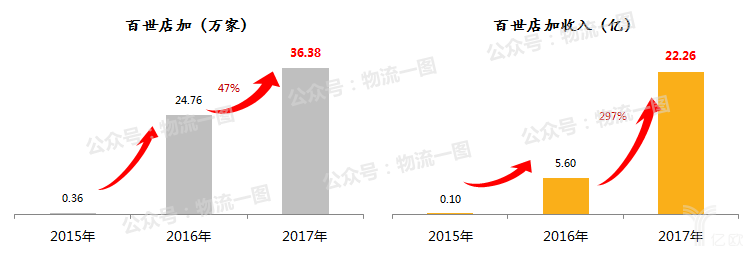 以物流為支撐構(gòu)建的B2B電子商務(wù)平臺(tái),去中介化為品牌商提升覆蓋率和效率,為零售終端提供一站式訂貨服務(wù)和統(tǒng)一倉(cāng)到店物流配送。2017年百世店加已入駐店鋪36.38萬(wàn)家,相比2016年增長(zhǎng)47%,2017年收入22.26億,相比2016年增長(zhǎng)297%。