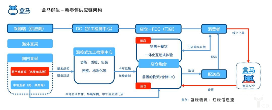 對于盒馬來說,生鮮僅僅是其一個出入口,其既有生鮮賣場,又是一個電商平臺。相同的是在這兩個版塊,盒馬都要做,且做出了物流供應鏈的創新: