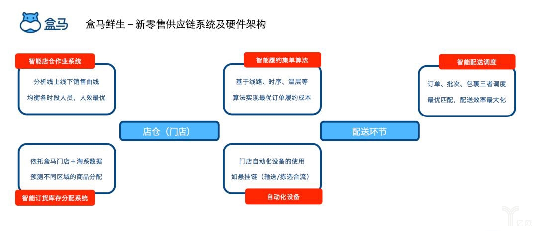 “新零售新物流到底是什么,是不是說店倉一體,有了懸掛鏈就行?我們內部認為這個是表面的,新應該是基于大數據,基于移動互聯網LBS的分析”。基于此盒馬推出了四個智能化,一個自動化,從而帶來分布式網絡里最核心的——前置倉的物流能力的提升。