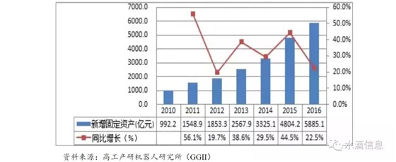 從行業(yè)供應(yīng)方面來看,高工產(chǎn)研機(jī)器人研究所(GGII)數(shù)據(jù)顯示,2016 年,倉儲(chǔ)行業(yè)新增固定資產(chǎn)規(guī)模達(dá)5,885.1 億元,同比增長22.5%。從數(shù)據(jù)可以看出,固定資產(chǎn)規(guī)模正急劇擴(kuò)張,由2010 年的992.2 億元增長至2016 的5,885.1 億元,年復(fù)合增長率達(dá)34.5%。