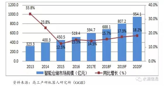 高工產(chǎn)研機(jī)器人研究所(GGII)認(rèn)為,中國經(jīng)濟(jì)的持續(xù)健康發(fā)展和中國物流業(yè)的崛起為倉儲(chǔ)業(yè)的發(fā)展提供了巨大的市場需求,加上制造業(yè)、商貿(mào)流通業(yè)外包需求的釋放和倉儲(chǔ)業(yè)戰(zhàn)略地位的加強(qiáng),未來智能倉儲(chǔ)存在巨大市場需求,預(yù)計(jì)到2020 年,智能倉儲(chǔ)市場規(guī)模將超過954 億元。