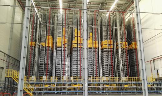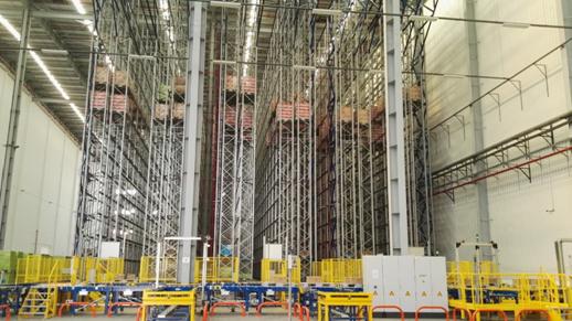 南京二期自動(dòng)托盤堆垛系統(tǒng)包含3個(gè)巷道共 10608個(gè)存儲(chǔ)位, 3臺(tái)高速自動(dòng)托盤堆垛機(jī),含雙深位載貨臺(tái),高度為22米雙深位存儲(chǔ)位,技術(shù)能力可達(dá)到雙循環(huán)90個(gè)托盤/小時(shí)(單循環(huán)可達(dá)到150托盤/小時(shí)左右)。傳統(tǒng)倉(cāng)庫(kù)主要利用橫梁托盤貨架配合高位叉車,效率低下,ASRS托盤堆垛系統(tǒng)中每一臺(tái)堆垛機(jī)的效率是傳統(tǒng)倉(cāng)庫(kù)高位叉車的4-5倍,而且不需要人員操作,準(zhǔn)確率高,人員成本接近為零。