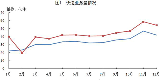12月份,全國快遞服務(wù)企業(yè)業(yè)務(wù)量完成54.2億件,同比增長29%;業(yè)務(wù)收入完成609.6億元,同比增長17.3%。