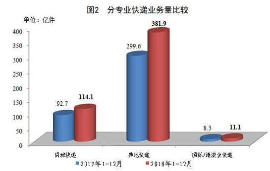 2018年,全國快遞服務(wù)企業(yè)業(yè)務(wù)量累計完成507.1億件,同比增長26.6%;業(yè)務(wù)收入累計完成6038.4億元,同比增長21.8%。其中,同城業(yè)務(wù)量累計完成114.1億件,同比增長23.1%;異地業(yè)務(wù)量累計完成381.9億件,同比增長27.5%;國際/港澳臺業(yè)務(wù)量累計完成11.1億件,同比增長34%。