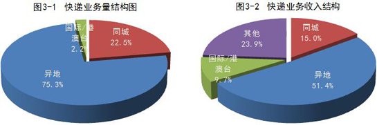 2018年,同城、異地、國際/港澳臺快遞業(yè)務(wù)量分別占全部快遞業(yè)務(wù)量的22.5%、75.3%和2.2%;業(yè)務(wù)收入分別占全部快遞收入的15%、51.4%和9.7%。與去年同期相比,同城快遞業(yè)務(wù)量的比重下降0.6個百分點,異地快遞業(yè)務(wù)量的比重上升0.5個百分點,國際/港澳臺業(yè)務(wù)量的比重上升0.1個百分點。