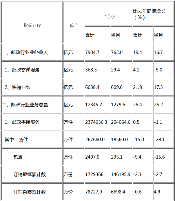 12月份,全行業(yè)業(yè)務(wù)收入完成763億元,同比增長16.7%;業(yè)務(wù)總量完成1279.6億元,同比增長26.2%。