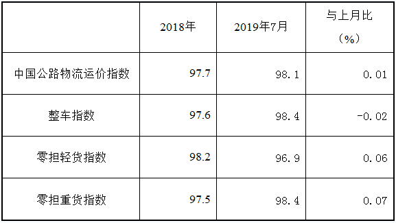 2019年7月份,由中國物流與采購聯合會和林安物流集團聯合調查的中國公路物流運價指數為98.1點,與上月基本持平,比去年同期回升0.7%。月內各周指數運行平緩,波動幅度在980點至981點之間。
