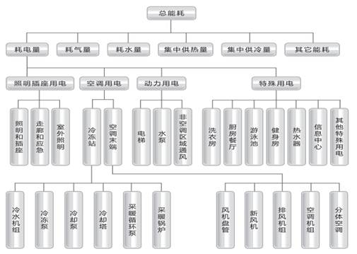 2) 分項原則:按建筑設(shè)施中不同用能系統(tǒng)進行分類采集和統(tǒng)計的能耗數(shù)據(jù),如:空調(diào)用電、動力用電(電梯、水泵)、照明用電、特殊用電(機房、餐廳)等。