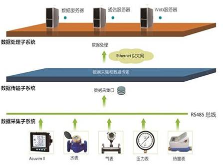 建筑能源管理系統(tǒng)由各類計量監(jiān)測儀表、數(shù)據(jù)采集器、數(shù)據(jù)服務(wù)器和能耗數(shù)據(jù)管理軟件系統(tǒng)組成,該系統(tǒng)將建筑內(nèi)的照明、空調(diào)、動力、給排水等能源使用情況進行集中采集、監(jiān)測、分析、管理及控制。系統(tǒng)的硬件組成在設(shè)計上分為3層結(jié)構(gòu),由三個獨立的子系統(tǒng)組成,分別為:數(shù)據(jù)采集子系統(tǒng)、數(shù)據(jù)傳輸子系統(tǒng)和數(shù)據(jù)處理子系統(tǒng)。