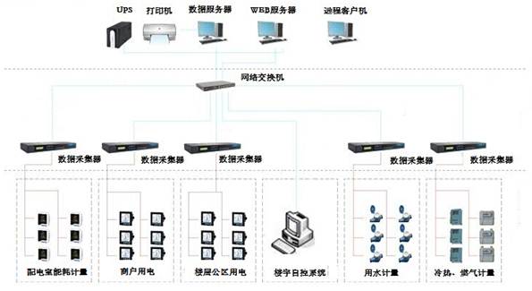 系統(tǒng)采用 “站控管理層——網(wǎng)絡(luò)通訊層——現(xiàn)場設(shè)備層”的分層分布式設(shè)計,站控管理層設(shè)置于建筑配電監(jiān)控室內(nèi),其設(shè)備包括安裝有能源管理系統(tǒng)軟件的數(shù)據(jù)服務(wù)器、WEB服務(wù)器和客戶瀏覽機、顯示器、UPS電源、打印機等,負責對能耗數(shù)據(jù)進行集中處理;網(wǎng)絡(luò)通訊層由網(wǎng)絡(luò)交換機、數(shù)據(jù)采集器及網(wǎng)絡(luò)通訊線組成,負責與建筑其它子系統(tǒng)及現(xiàn)場設(shè)備層的各類儀表裝置進行通訊;現(xiàn)場設(shè)備層是各級能耗設(shè)備計量儀表,如建筑配電室計量儀表、樓層計量儀表、租戶計量儀表、餐廳用水計量儀表、餐廳燃氣表、暖通系統(tǒng)冷熱量表等。