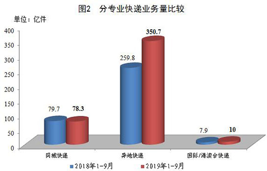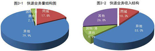 1-9月,同城、異地、國際/港澳臺(tái)快遞業(yè)務(wù)量分別占全部快遞業(yè)務(wù)量的17.8%、79.9%和2.3%;業(yè)務(wù)收入分別占全部快遞收入的10.3%、53%和9.9%。與去年同期相比,同城快遞業(yè)務(wù)量的比重下降5.1個(gè)百分點(diǎn),異地快遞業(yè)務(wù)量的比重上升5.1個(gè)百分點(diǎn),國際/港澳臺(tái)業(yè)務(wù)量的比重基本持平。
