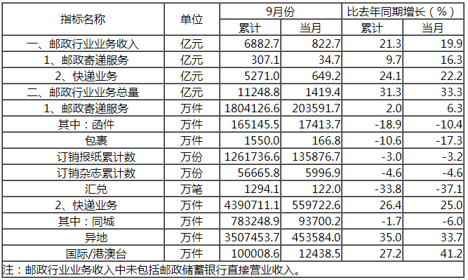 1-9月,郵政行業(yè)業(yè)務(wù)收入(不包括郵政儲(chǔ)蓄銀行直接營業(yè)收入)累計(jì)完成6882.7億元,同比增長(zhǎng)21.3%;業(yè)務(wù)總量累計(jì)完成11248.8億元,同比增長(zhǎng)31.3%。