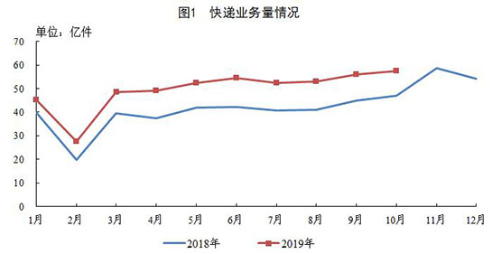 10月份,全國快遞服務企業業務量完成57.6億件,同比增長22.7%;業務收入完成658億元,同比增長23.2%。