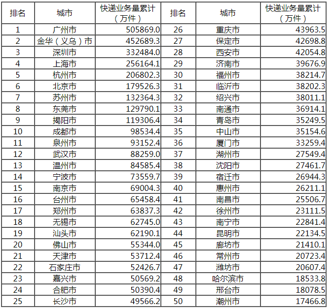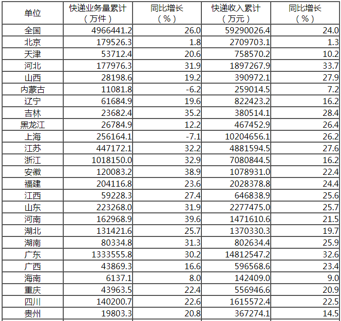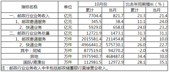 10月份,郵政服務業務總量完成225.4億元,同比增長37.4%;郵政寄遞服務業務量完成21.1億件,同比增長10%;郵政寄遞服務業務收入完成38.4億元,同比增長24%。