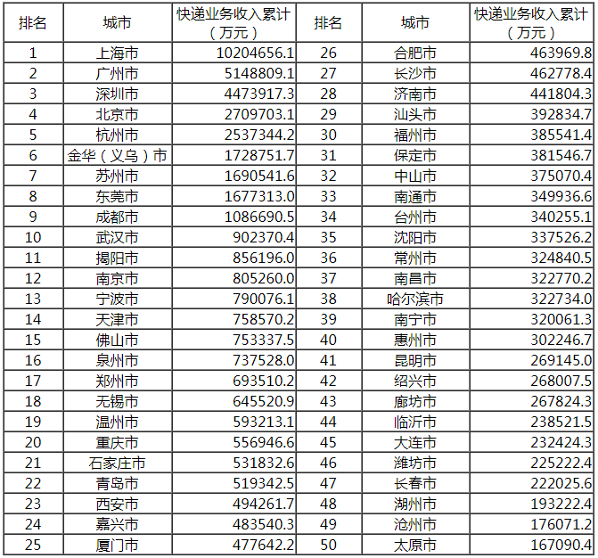 1-10月份,全國快遞服務企業業務量累計完成496.6億件,同比增長26%;業務收入累計完成5929億元,同比增長24%。其中,同城業務量累計完成87.8億件,同比下降2%;異地業務量累計完成397.6億件,同比增長34.4%;國際/港澳臺業務量累計完成11.3億件,同比增長28.1%。