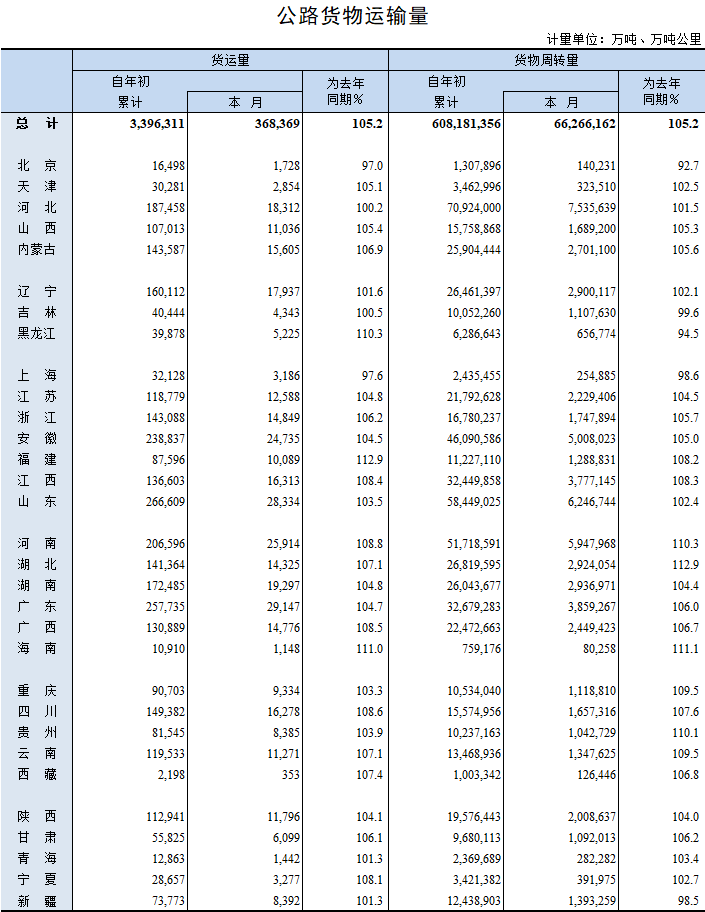 2019年10月公路貨物運輸量
