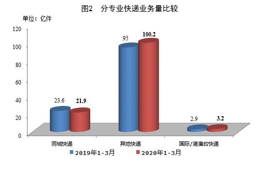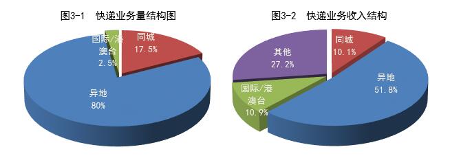 一季度,同城、異地、國際/港澳臺快遞業(yè)務(wù)量分別占全部快遞業(yè)務(wù)量的17.5%、80%和2.5%;業(yè)務(wù)收入分別占全部快遞收入的10.1%、51.8%和10.9%。與去年同期相比,同城快遞業(yè)務(wù)量的比重下降1.9個百分點(diǎn),異地快遞業(yè)務(wù)量的比重上升1.8個百分點(diǎn),國際/港澳臺業(yè)務(wù)量的比重上升0.1個百分點(diǎn)。