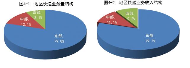 一季度,東、中、西部地區(qū)快遞業(yè)務(wù)量比重分別為79.8%、12.1%和8.1%,業(yè)務(wù)收入比重分別為79.7%、11.1%和9.2%。與去年同期相比,東部地區(qū)快遞業(yè)務(wù)量比重上升0.3個百分點(diǎn),快遞業(yè)務(wù)收入比重下降0.3個百分點(diǎn);中部地區(qū)快遞業(yè)務(wù)量比重下降0.7個百分點(diǎn),快遞業(yè)務(wù)收入比重下降0.2個百分點(diǎn);西部地區(qū)快遞業(yè)務(wù)量比重上升0.4個百分點(diǎn),快遞業(yè)務(wù)收入比重上升0.5個百分點(diǎn)。