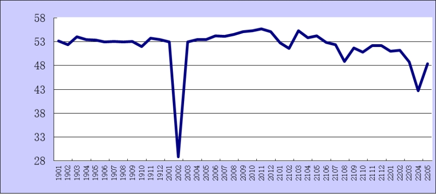 中國(guó)物流與采購(gòu)聯(lián)合會(huì)、國(guó)家統(tǒng)計(jì)局服務(wù)業(yè)調(diào)查中心采購(gòu)經(jīng)理調(diào)查發(fā)布的2022年5月份綜合PMI產(chǎn)出指數(shù)為48.4%,較上月上升5.7個(gè)百分點(diǎn)。該指數(shù)是PMI指標(biāo)體系中反映當(dāng)期全行業(yè)(制造業(yè)和非制造業(yè))產(chǎn)出變化情況的綜合指數(shù),由制造業(yè)生產(chǎn)指數(shù)與非制造業(yè)商務(wù)活動(dòng)指數(shù)加權(quán)求和而成,權(quán)數(shù)分別為制造業(yè)和非制造業(yè)占GDP的比重。