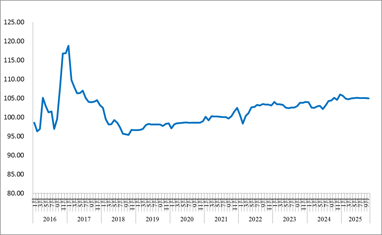 2025年10月份,由中國物流與采購聯(lián)合會和林安物流集團聯(lián)合調(diào)查的中國公路物流運價指數(shù)為104.9點,環(huán)比回落0.10%,同比去年回落0.11%。從月內(nèi)看,第二、三、四周運價指數(shù)環(huán)比回升,第一、五周運價指數(shù)環(huán)比回落。