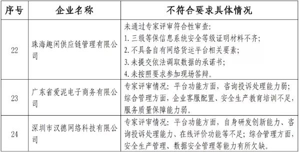 二、廣州快兔物流科技有限公司等24家企業(yè)(名單見附件2)平臺(tái)因未通過信息接入測試或?qū)<以u(píng)審,以及主動(dòng)申請(qǐng)延后審核等原因,暫不符合線上服務(wù)能力有關(guān)要求。其中: