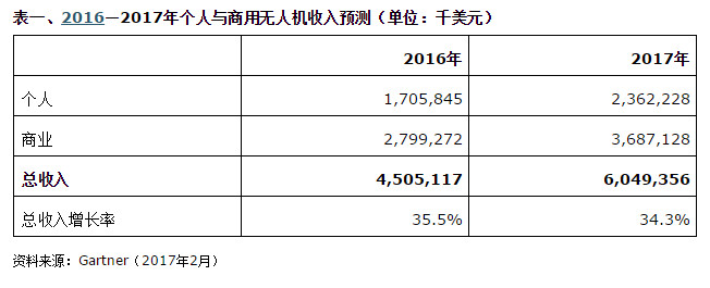 Gartner預測,個人與商用無人機的產量正在快速增長,無人機的全球市場收入預計將增加34%,在2017年將超過60億美元,并在2020年超過112億美元(參見表一)。2017年無人機的產量將接近300萬架,比2016年增加39%(參見表二)。