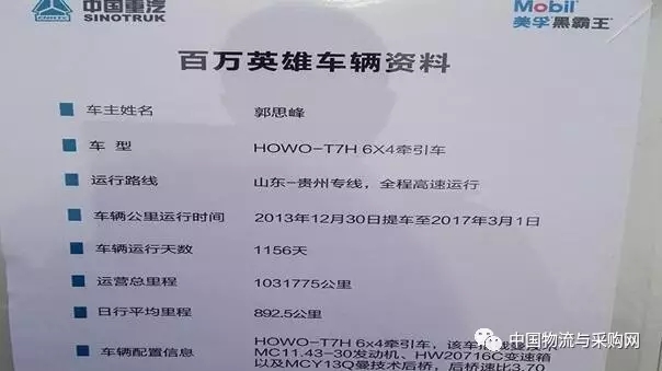 中國重汽車主郭思峰所駕駛的HOWO-T7H 6x4牽引車,該車搭載曼技術MC11.43-30發動機、HW20716C變速箱以及MCY13Q曼技術后橋,后橋速比3.70,車輛主要行駛山東-貴州專線,全程高速運行。這輛英雄車的行駛里程于2016年12月24日達到100萬公里,成為2016年度內第二輛突破100萬公里的中國重汽曼技術產品。