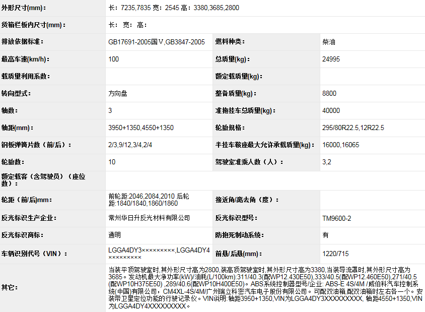 從公告來看,乘龍T5配備濰柴發動機,提供375、400、430、460四種不同馬力選擇;在整車長度方面,乘龍T5提供7.535米和7.835米兩種選擇,軸距分別為3.95米+1.35米和4.55米+1.35米。在駕駛室方面,乘龍T5有高頂、平頂兩種選擇。平頂駕駛室高2.8米,高頂駕駛室則為3.38米,高頂駕駛室可選裝導流罩,裝配后整車高度為3.685米。