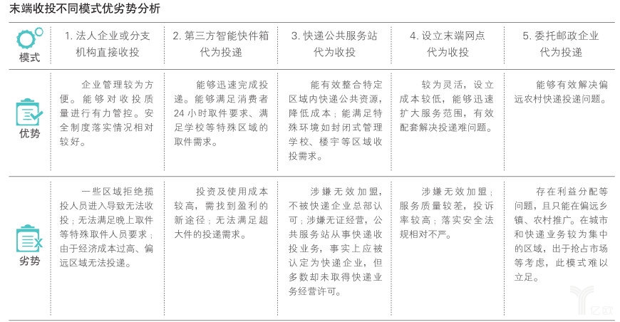 我們將末端收投分為5種模式(詳見上表)。需要注意的是,除企業直接收投的模式外,其余4種模式的本質就是多個快遞品牌共享一個基層收投平臺,這也是當前共享經濟在快遞業的有力實踐。