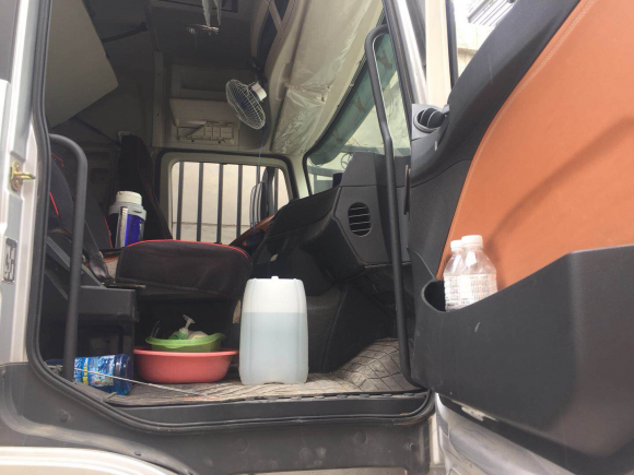 由于跑長途的需要,駕駛室內放著大桶水、洗漱用品等