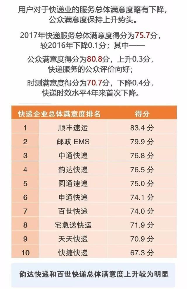 郵政局公布的快遞得分情況和我們的使用體驗幾乎一樣,體驗最好的兩家快遞是順豐速運和京東物流。一般買電子產(chǎn)品都是使用順豐,穩(wěn)定可靠。而京東第二天就能送達(dá),快速方便。其他幾家快遞幾乎都處于同一水平,不受歡迎并且評分較低的快遞依舊是這幾家,這些快遞相較于2017年快遞服務(wù)滿意度調(diào)查有進(jìn)步嗎?