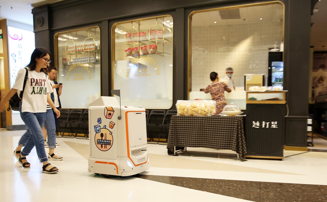 近日,在北京朝陽大悅城逛街的人發現一輛印著Segway Robotics和美團標志的的配送機器人在商場內不時穿梭,所到之處吸引路人頻頻駐足觀望。配送機器人到達商場門口時,美團外賣小哥就從機器人“肚子”里取出客戶預定的餐食,然后絕塵而去。