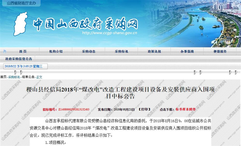 中國政府采購網發布《永濟市經信局2018年“煤改電”改造工程建設項目設備采購及安裝項目中標公告》。中國山西政府采購網發布《稷山縣經信局2018年“煤改電”改造工程建設項目設備及安裝供應商入圍項目中標公告》。