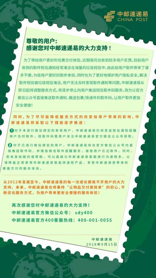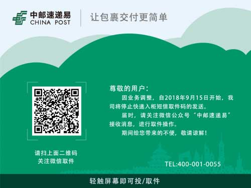 據中郵速遞易發布的通告顯示,為了盡可能降低服務方式的改變給用戶帶來的影響,中郵速遞易此次調整服務方式將采取逐步推進。其中,對于未能及時進行微信綁定的新老用戶,中郵速遞易仍將發送短信通知提醒用戶及時取件,但取件碼需用戶關注中郵速遞易官方微信公眾號獲取。