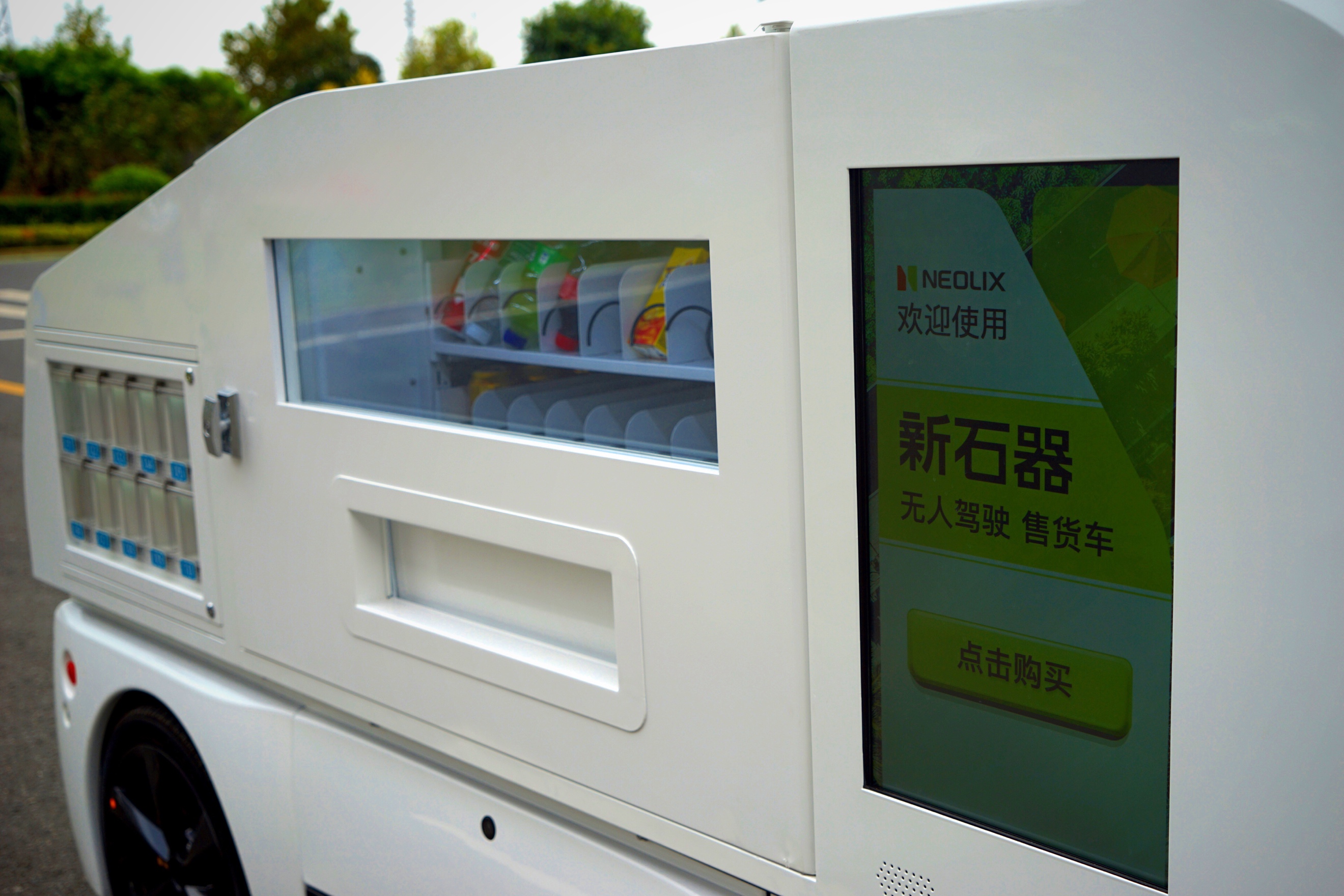 新石器無人零售車基于原有無人物流車,將原有智能貨箱替換為智能自動售貨柜,并加入智能售賣系統。用戶可以通過微信小程序實時預約下單,新石器無人零售車則自動到達預約地點完成線下購買。首批商業運營在常州、雄安新區等地區已經超過一個月時間,成交量已經突破1萬單。