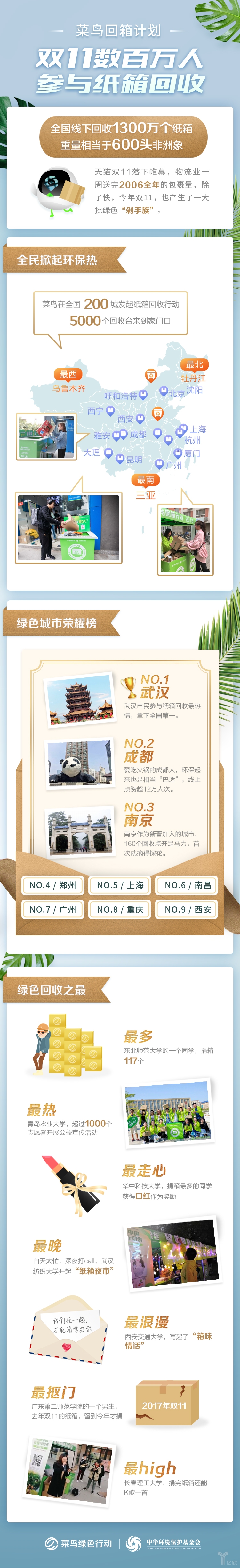 從菜鳥網(wǎng)絡(luò)獲悉,雙11期間,全國5000個(gè)回收臺(tái),線下回收快遞紙箱約1300萬個(gè),線上點(diǎn)贊和捐箱的人次突破200萬。