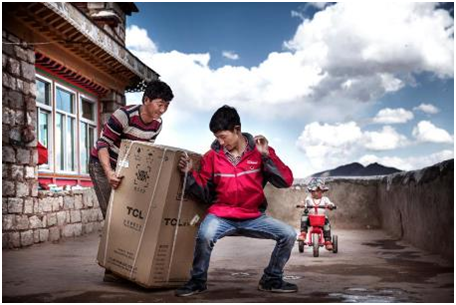 世界屋脊嬌艷的陽光下,京東小哥扎西從縣城風塵仆仆地趕來。驅車上百公里,再一步步將洗衣機扛上了多杰家的山崗。