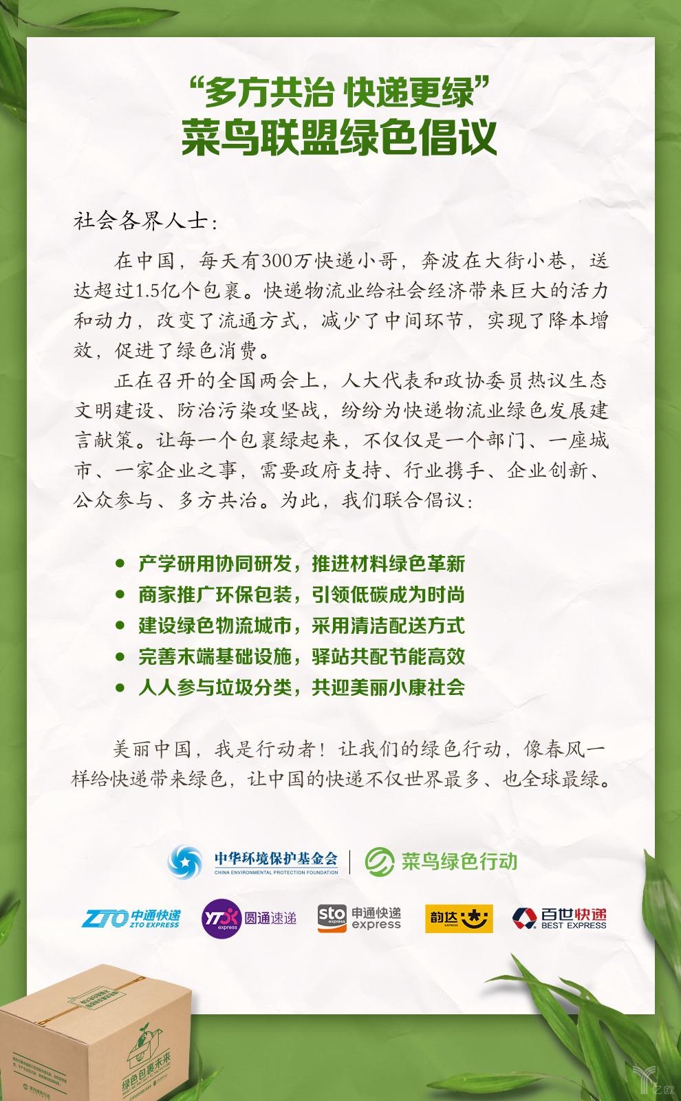倡議中,菜鳥聯(lián)盟向全社會呼吁:產(chǎn)學(xué)研用協(xié)同創(chuàng)新,讓環(huán)保包材便宜好用;商家推廣綠色包裝,讓簡約包裝成為時尚;推廣智能驛站共同配送,建設(shè)綠色物流城市,人人參與垃圾分類,共迎美麗小康社會。