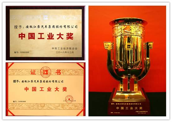 2018年12月,第五屆中國工業大獎發布會在北京人民大會堂隆重舉行,江淮汽車榮獲我國工業領域最高獎項——中國工業大獎,成為國內首家獲此殊榮的綜合型汽車企業。