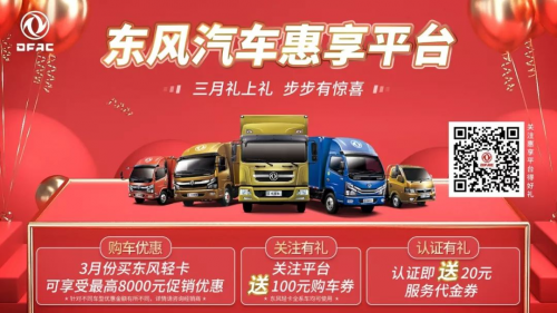 周年狂歡期間,凡是關(guān)注“東風(fēng)汽車(chē)惠享平臺(tái)”的卡友即可獲得“關(guān)注禮”,獲贈(zèng)100元東風(fēng)輕卡全系車(chē)購(gòu)車(chē)券。而此時(shí)進(jìn)店購(gòu)車(chē),還可獲得“購(gòu)車(chē)禮”,最高可享受8千元促銷(xiāo)優(yōu)惠。不僅如此,為了方便各位輕松購(gòu)車(chē),東風(fēng)輕卡還推出了“0首付、0利息”的“金融禮”,讓卡友全無(wú)后顧之憂,實(shí)現(xiàn)輕松購(gòu)車(chē)。總之,這次東風(fēng)輕卡負(fù)責(zé)送送送降降降,卡友只需負(fù)責(zé)購(gòu)購(gòu)購(gòu)就行了。