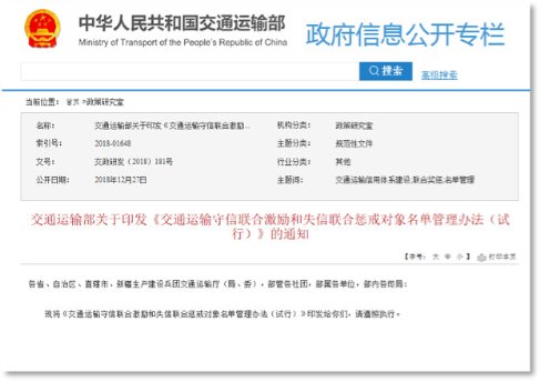 2018年12月,交通部發(fā)布了《交通運輸守信聯(lián)合激勵和失信聯(lián)合懲戒對象名單管理辦法(試行)的通知》,其中失信聯(lián)合懲戒對象除了貨運源頭企業(yè),道路運輸企業(yè)及法人,還包括“貨運車輛和貨運車輛駕駛?cè)?rdquo;,其中關(guān)聯(lián)信用數(shù)據(jù)的來源除了參考交通部的行政決定、行政許可、行政處罰等,還會通過其他權(quán)威合法的數(shù)據(jù)來源來對交通信用體系進行補充。