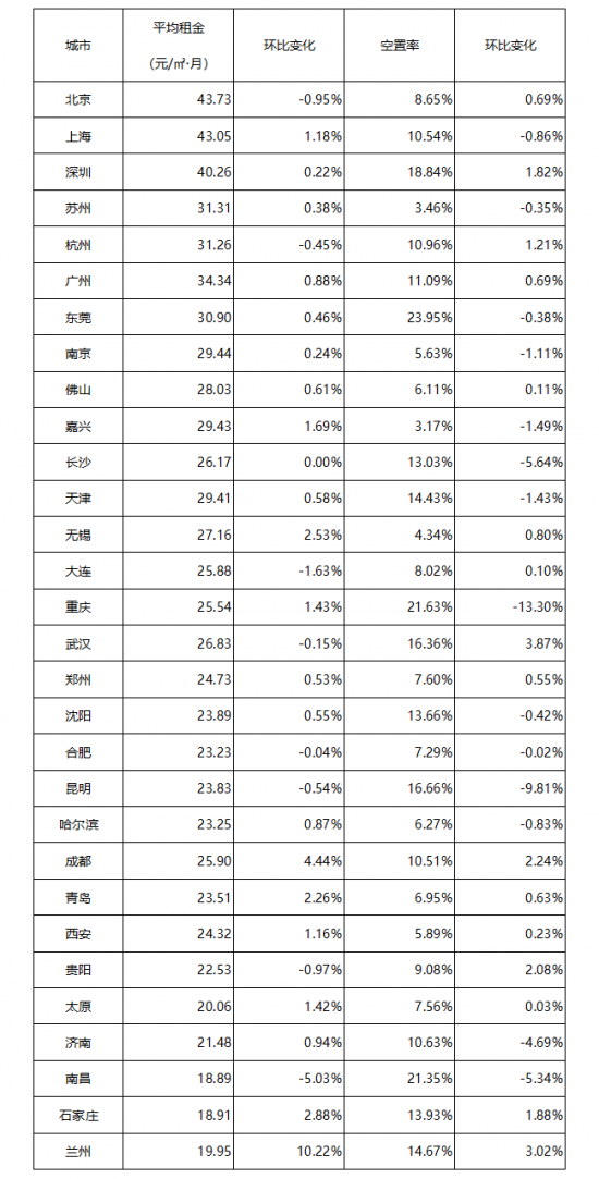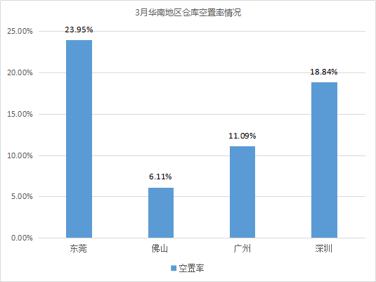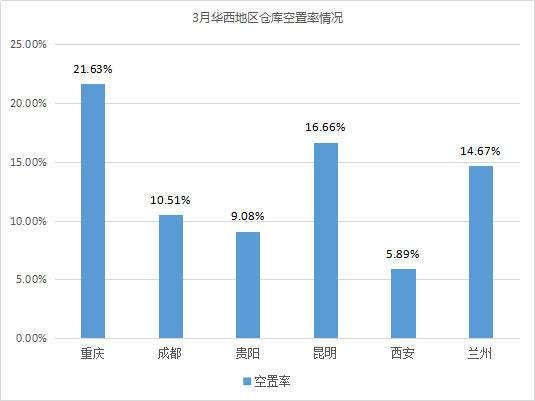 倉庫空置率最高的城市為東莞、重慶、南昌,均超過20%。相較2月,東莞空置率波動不大;重慶、南昌因春節后企業陸續開工,集中釋放了倉庫租賃需求,倉庫空置率有所下降(降幅分別為13.30%、5.34%)。
