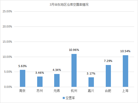 倉庫空置率最低的城市為嘉興、蘇州、無錫,均低于5%。相較2月,嘉興、蘇州兩地倉庫租戶以物流企業為主,經春節假期的短期停運,物流企業業務逐漸恢復,倉儲項目逐步啟動,倉庫租賃需求逐步回升,倉庫空置率有所下降,降幅分別為1.49%、0.35%;春節銷售旺季過后,無錫許多空置倉庫重新投入市場,導致倉庫空置率有所上漲(漲幅為0.80%),據不完全統計,無錫錫山區約24,332㎡、新吳區約5,000㎡、濱湖區約20,000㎡空置倉庫重新投入市場。